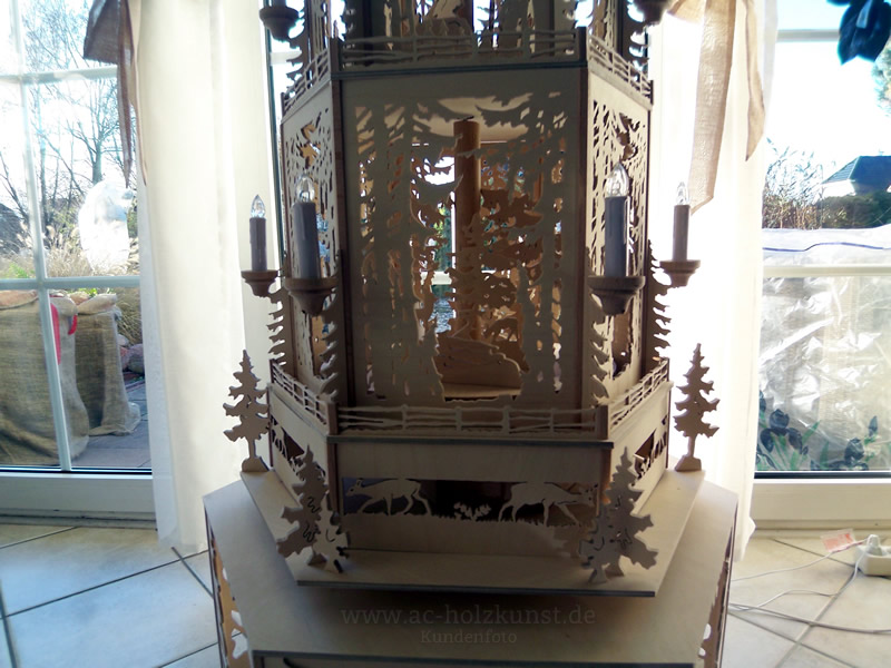 Dann kommt noch ein Sockel dazu und schon ist der Traum von ca. 1,80 m fertig. Die Pyramide wird durch einen Motor angetrieben, sie geht mit Led-Kerzen (Fernbedienung) und mit echten Kerzen.