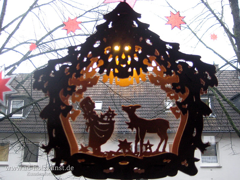 Das Fensterbild besteht aus Buchensperrholz. Die Beleuchtung wurde mit LED- Stripes angebracht.