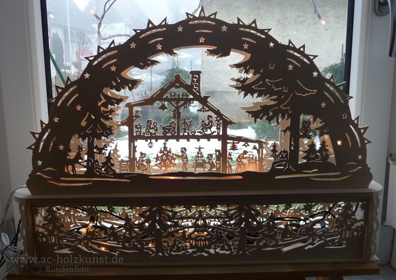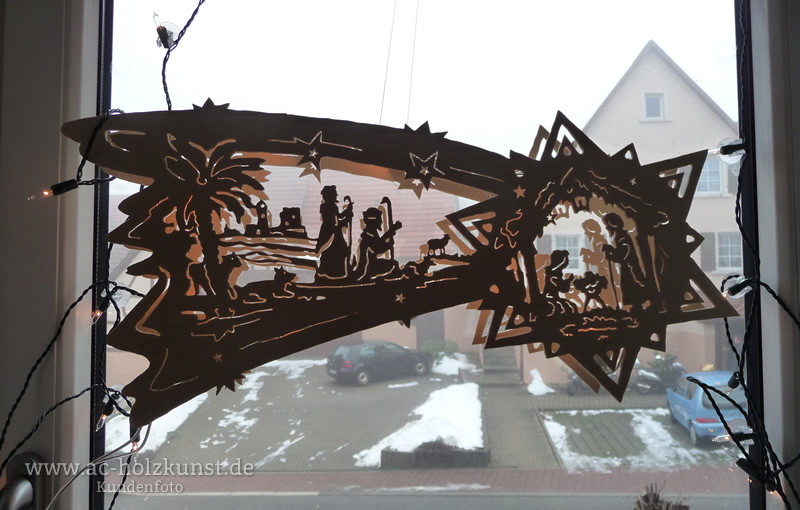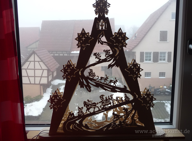Gerfertigt wurden, jeweils mit 4 mm Sperrholz und einer Dekupiersäge, filigrane Motive wie den Schwibbogen „Engelpassion“, ein Dreiecksleuchter mit Motiv „Schlittenfahrt“, ein Fensterbild „Sternenschweif“ und einen weiteren Schwibbogen mit Motiv „Erzgebirgshaus“. Wir finden, die Arbeiten sehen wirklich prima aus. Gerade bei solch filigranen Motiven, steckt schon eine Menge Arbeit drin.