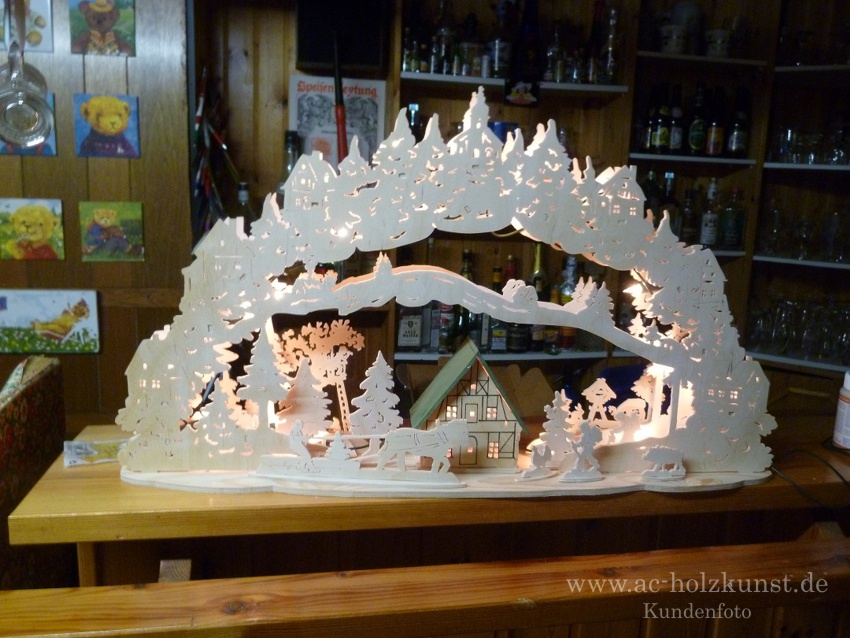 Info Herr I.: „Anbei drei Bilder von Schwibbögen, die nach Ihren Vorlagen angefertigt wurden. Bei einem Schwibbogen hatte ich für mein Enkelkind einen Adventskalender untergebaut.