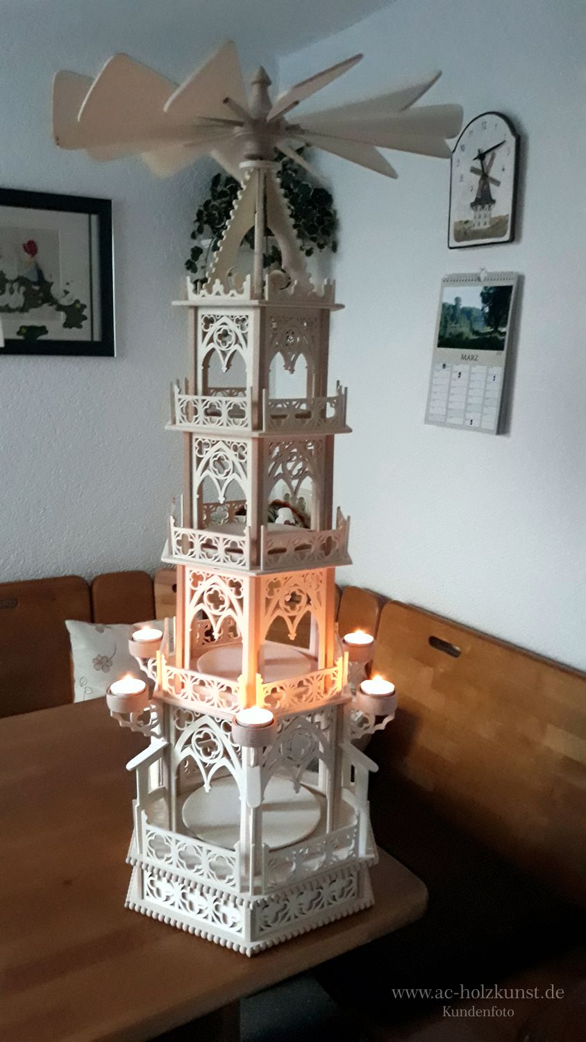 ich habe die Gotische Pyramide etwas umgestaltet, von drei auf 4 Etagen, der Sockel und die erste Etage sowie die Spitze sehen etwas anders aus. Die einzelnen Etagen habe ich auf dem Drucker verkleinert, um so die richtige Größe zu bekommen. Habe die Halterung von den Kerzen etwas anders gezeichnet habe darauf Tüllen für Teelichter gedrechselt, ich bin der Meinung dies ist sicherer als Pyramidenkerzen und sie brennen auch noch länger.