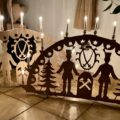 Dieser XL-Schwibbogen zeigt ein für das Erzgebirge typisches Motiv mit Engel & Bergmann, Tiere, Tannen und Reiterlein. Der Schwibogen wurde nach unserer Laubsägevorlage für einen XL-Schwibbogen hergestellt.