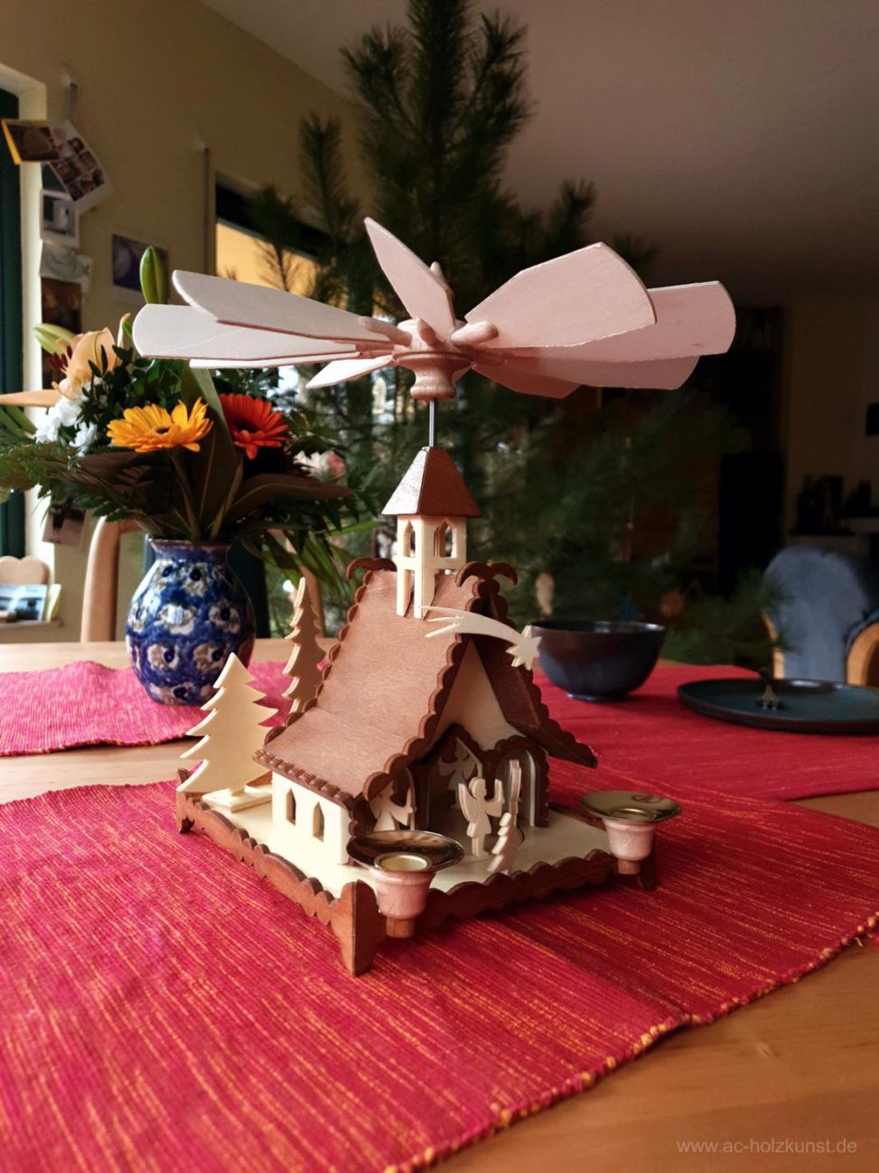 Bei der Pyramide mit den Engeln kann ich nur empfehlen, die vorderen Kerzen etwas vorzusetzen, um ein Anbrennen des Daches zu vermeiden. Aber die haben Sie offenbar ohnehin nicht mehr im Programm.