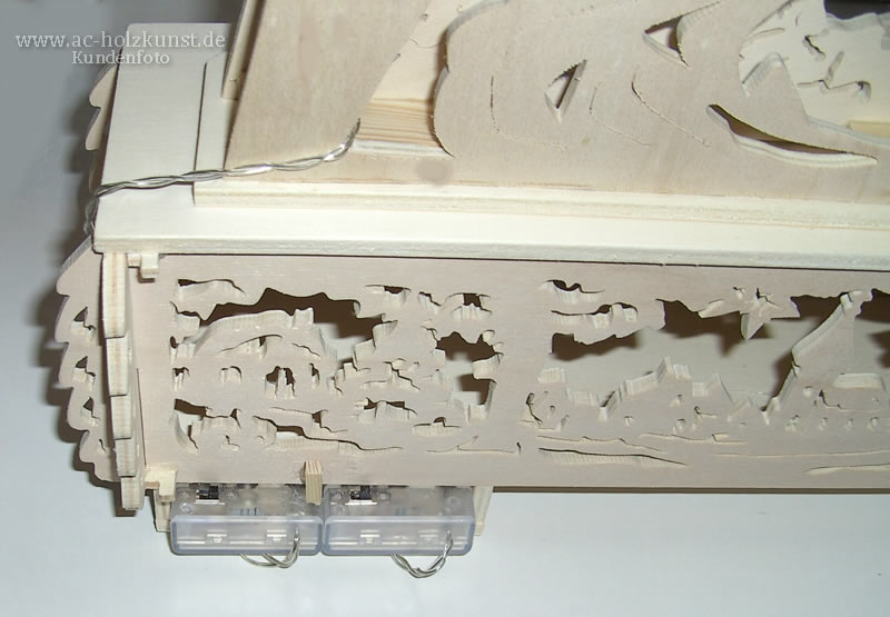 Info Herr H.: „Hallo AC-Holzkunst, auch ich möchte Ihnen wieder eine meiner neuen Bastelarbeiten vorstellen, da einige meiner Bastelkollegen schon die Himmlische Abfahrt mit Sockel gebaut haben, habe ich mir dieses Mal einfallen lassen die Beleuchtung mal Netz unabhängig zu machen.