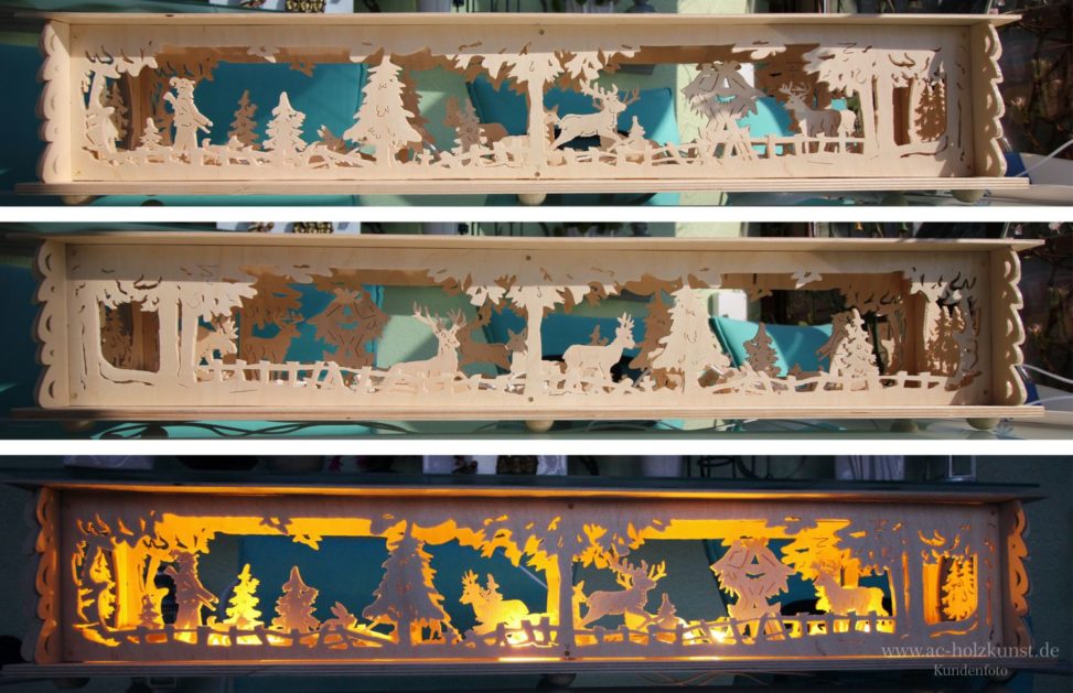 [Artikel: 999] Sockel für Schwibbogen als Unterbau. Motive: Wald, Tiere, Jäger und Bäume zum Aufstellen. Größe: 70 cm.