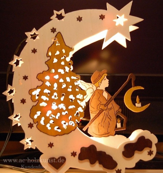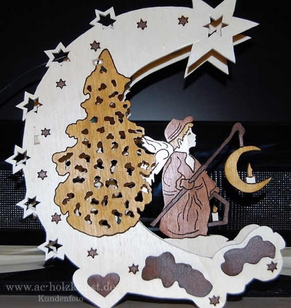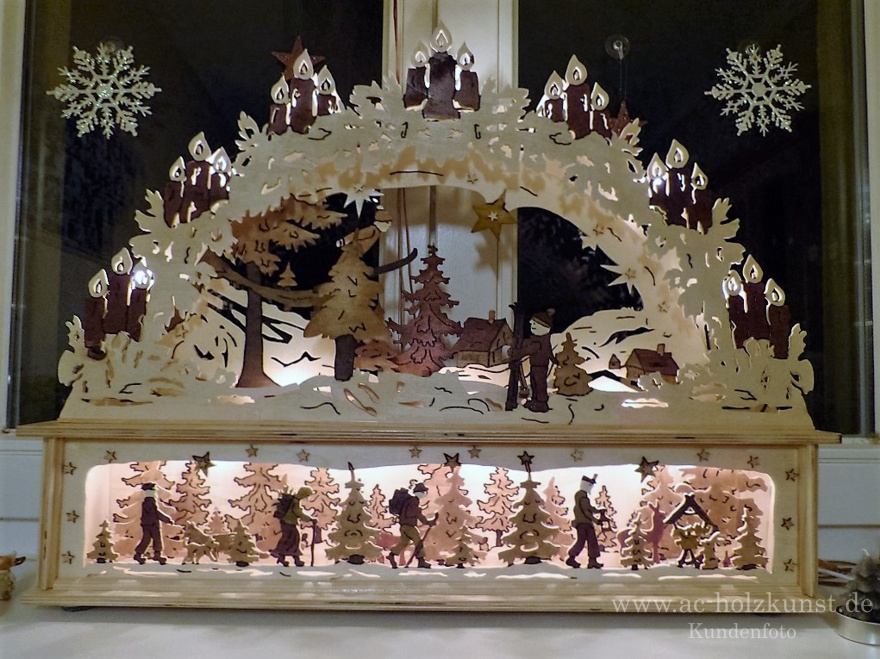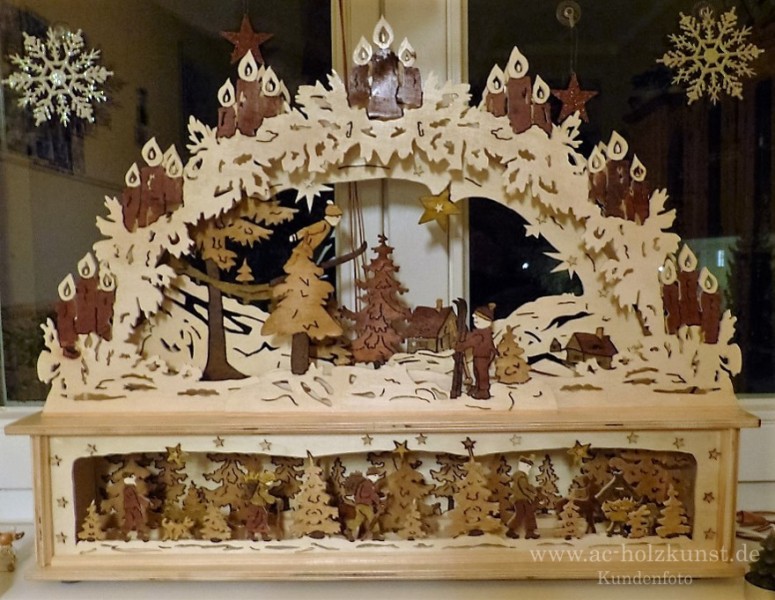 Die Lichterbögen und das Fensterbild habe ich immer dann weiter gebastelt, wenn ich mal keine Lust hatte an der Pyramide weiterzuarbeiten. Die Lichterbögen sind mit den unteren Lichtkasten kompl. hergestellt worden und nicht einzeln verwendbar. Sie sind ca. 60 cm x 55 cm groß und zum Teil aus mehreren Vorlagen hergestellt worden.