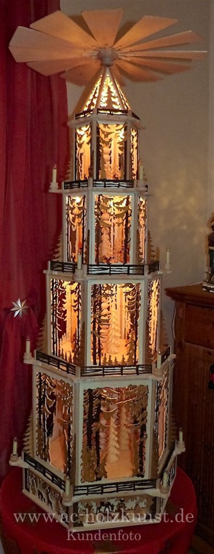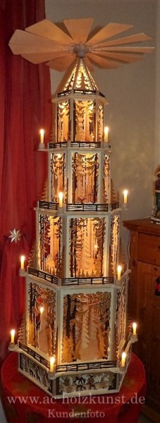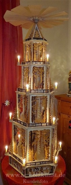 Die Pyramide ist 1,56 m hoch und elektrisch angetrieben, man hat die Möglichkeit 3 verschiedene Beleuchtungsarten zu schalten. Das Außenlicht besteht aus 16 Kerzen, die Etagenweise versetzt angebracht sind, die innere Beleuchtung besteht aus 96 Microlämpchen. Ich habe ca. 22 Monate an der Pyramide gearbeitet. Da aber noch ein zusätzliches Unterteil angefertigt wird, ist sie noch nicht ganz vollständig, aber schon im Einsatz. Sie wird nach der Fertigstellung ca. 2,00 m hoch sein. Was ich aber bei dieser Pyramide nicht selber gebastelt habe, sind die Figuren und Bäume.