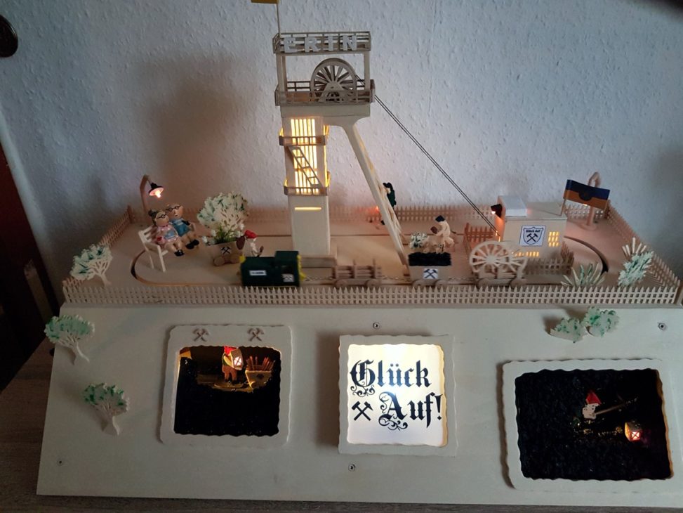 Ausgestattet mit Motor und die Beleuchtung mit 8  LED Kerzen inkl. Fernbedienung. Dann habe ich einmal den großen mech. Schwibbogen (Bergwerk) verkleinert,