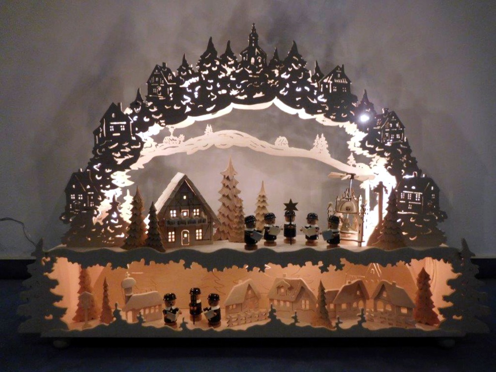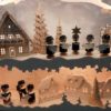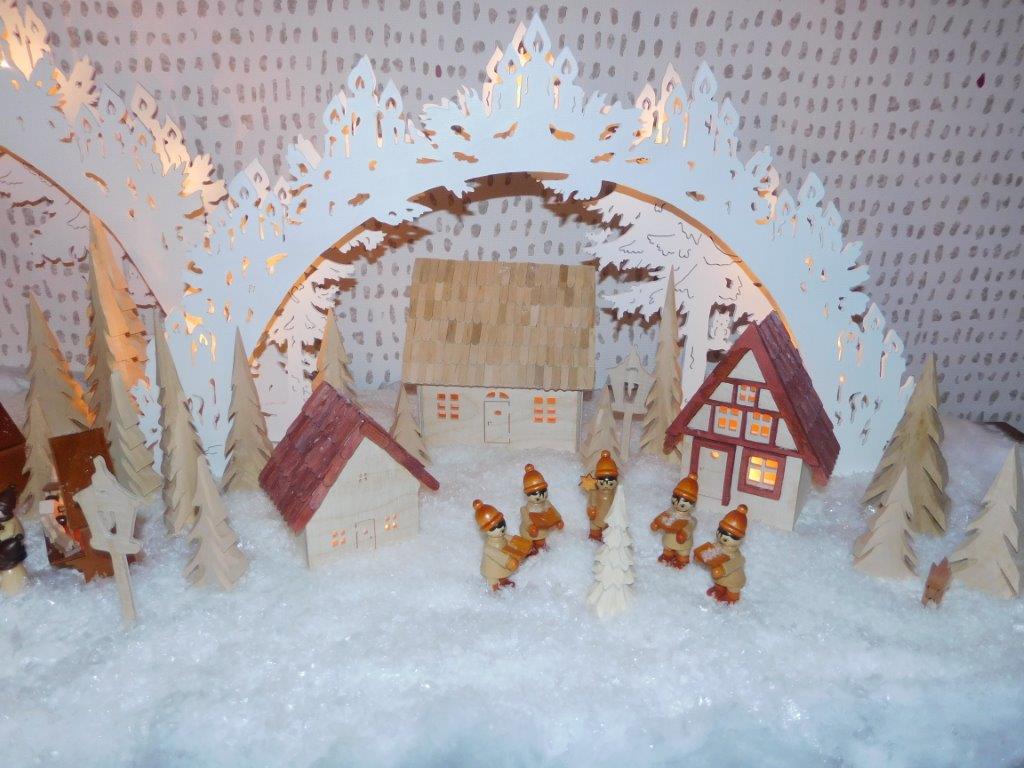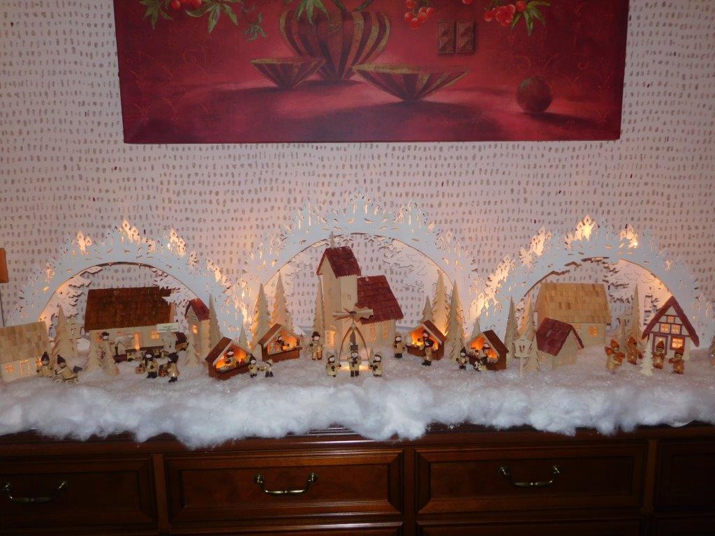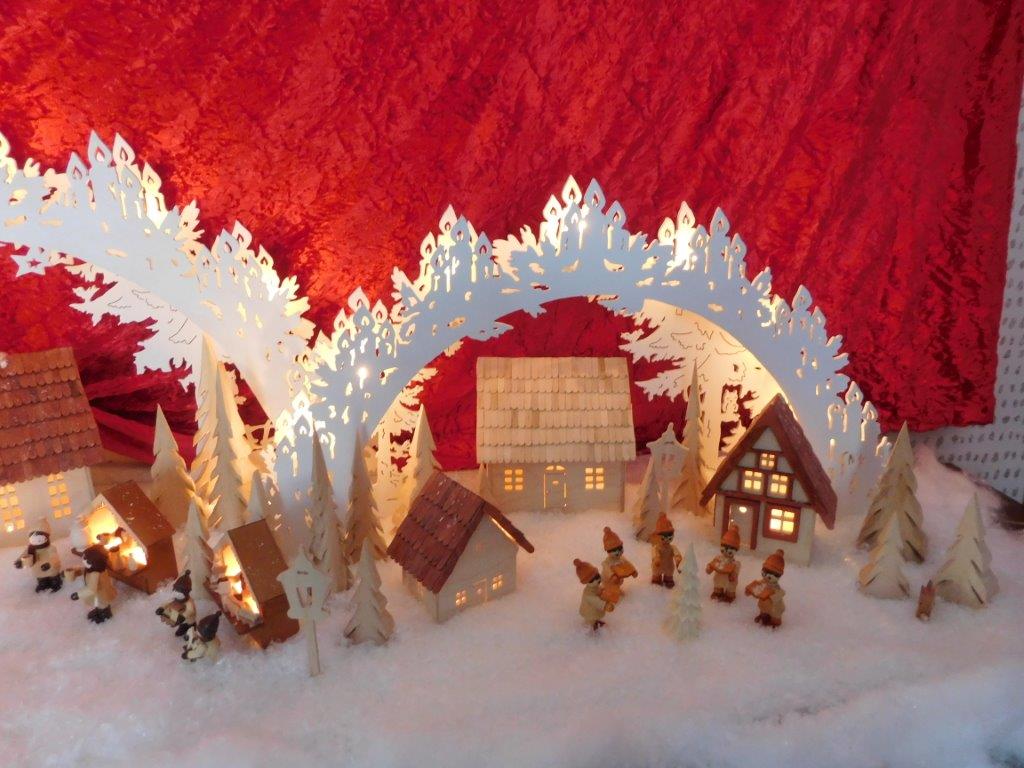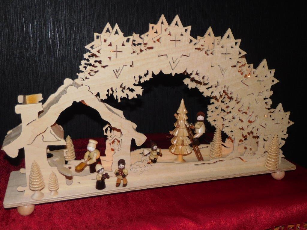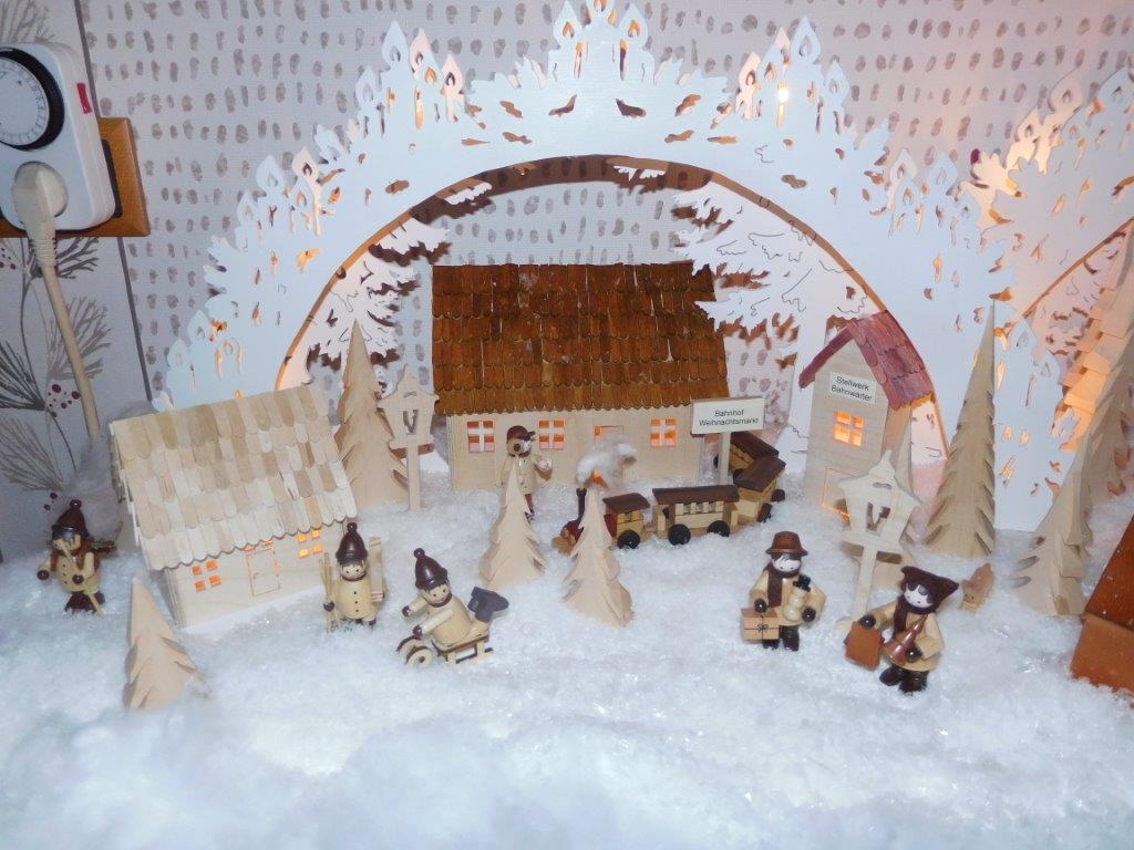 So finden sich oft kleine Holzfiguren aus dem Erzgebirge, eigene Sockelmotive (Unterbau) oder spezielle Lichtideen in den Arbeiten wieder.