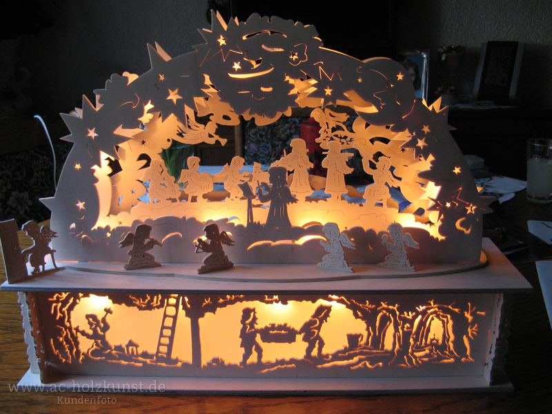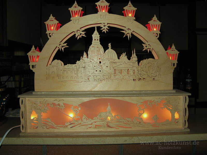 Die Fotos 2 u. 3 zeigen je einen Schwibbogen mit Unterbau beleuchtet. Vielen Dank.