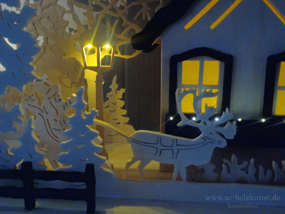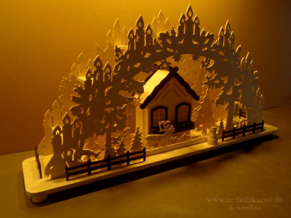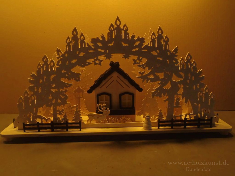 Info Frau Zemann: „Hallo, ich möchte mich jetzt auch mal an der Kundengalerie beteiligen. Ich habe den Schwibbogen etwas modifiziert und das Innenleben rausgezeichnet. Dazu gekommen ist eine beleuchtete Laterne, ein Haus mit Balkonbeleuchtung und ein beleuchteter Weihnachtsbaum. Alles in SMD-LED Technik. Alle Einzelteile sind von mir gezeichnet.“
