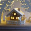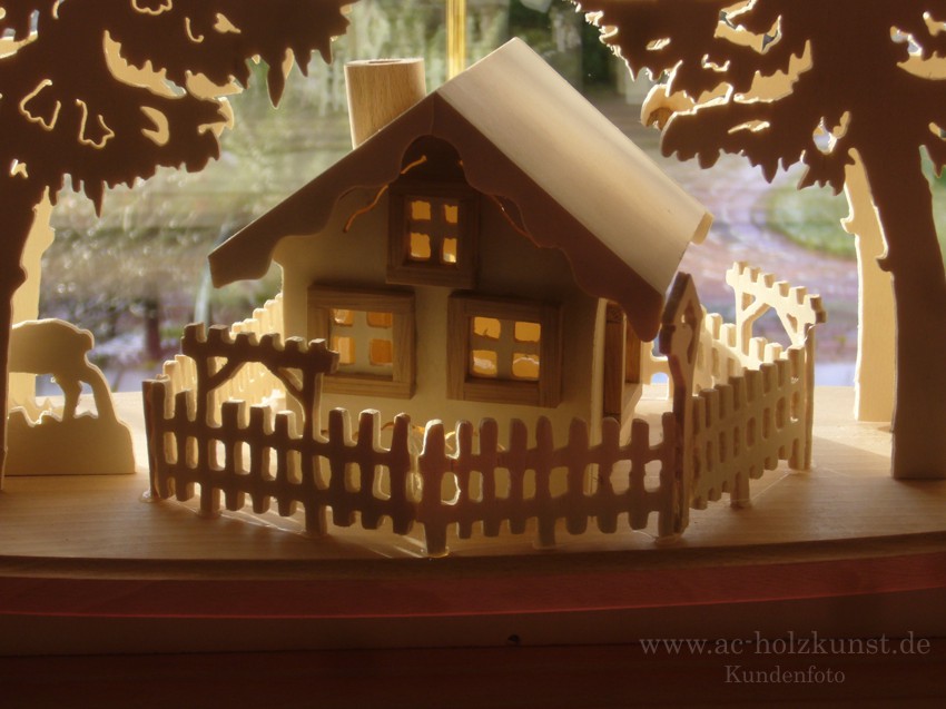 Auf dem Brett steht nun das Haus, die Futterkrippe und die Gruppe mit den Rehen. Der Schwibbogen steht im großen Wohnzimmerfenster, ohne Fensterbank, auf einem Buchenbrett das ich am Rolladenkasten aufgehängt habe. Die Beleuchtung besteht aus einer 20er LED-Lichterkette. Das Pappelspeerholz ist 3mm und die Buchenbretter für den Fuss und den Zwischenboden sind 16mm dick.