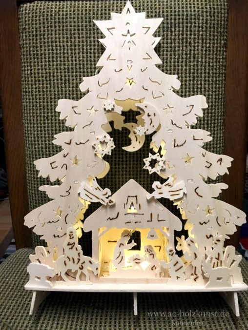 Herr L. aus dem Saarland hat unseren Schwibbogen „Schwibbogen Weihnachtskrippe mit Turm Christi Geburt“ gesägt.
