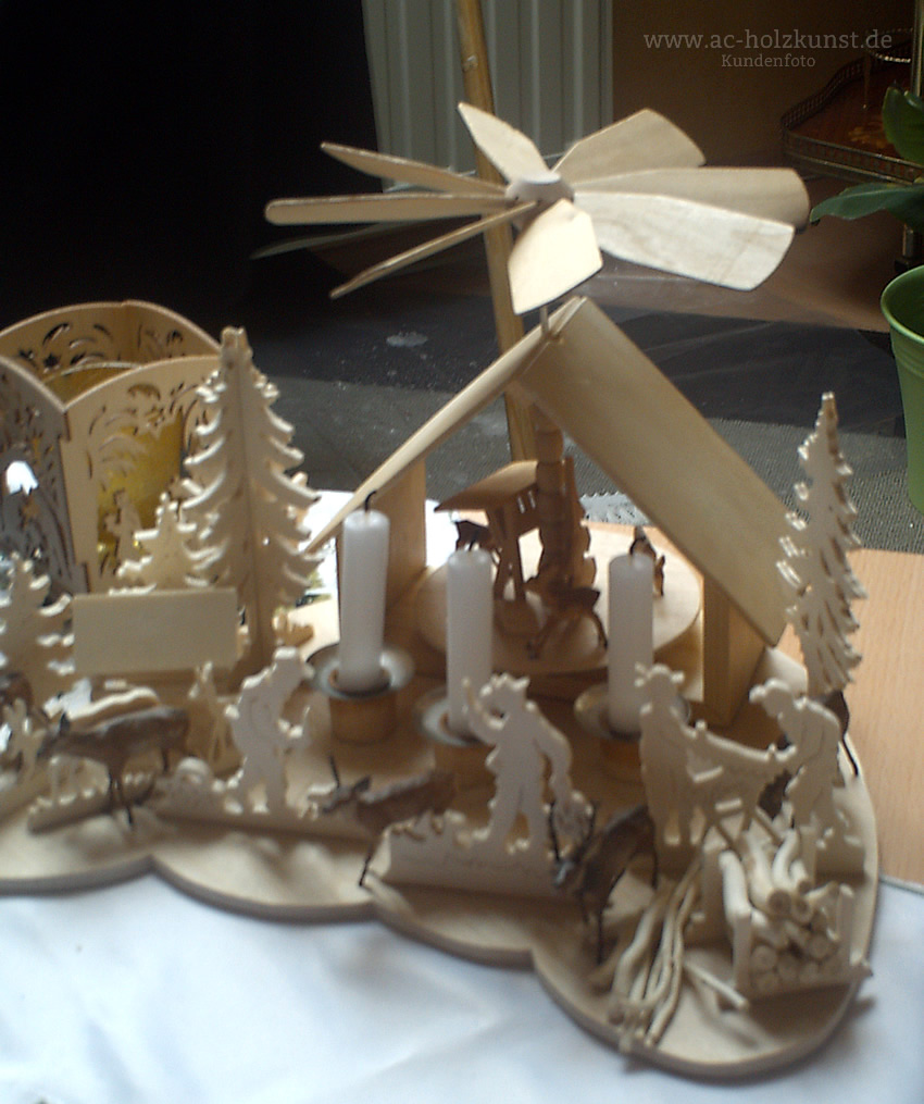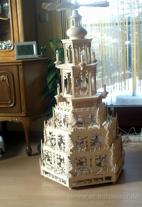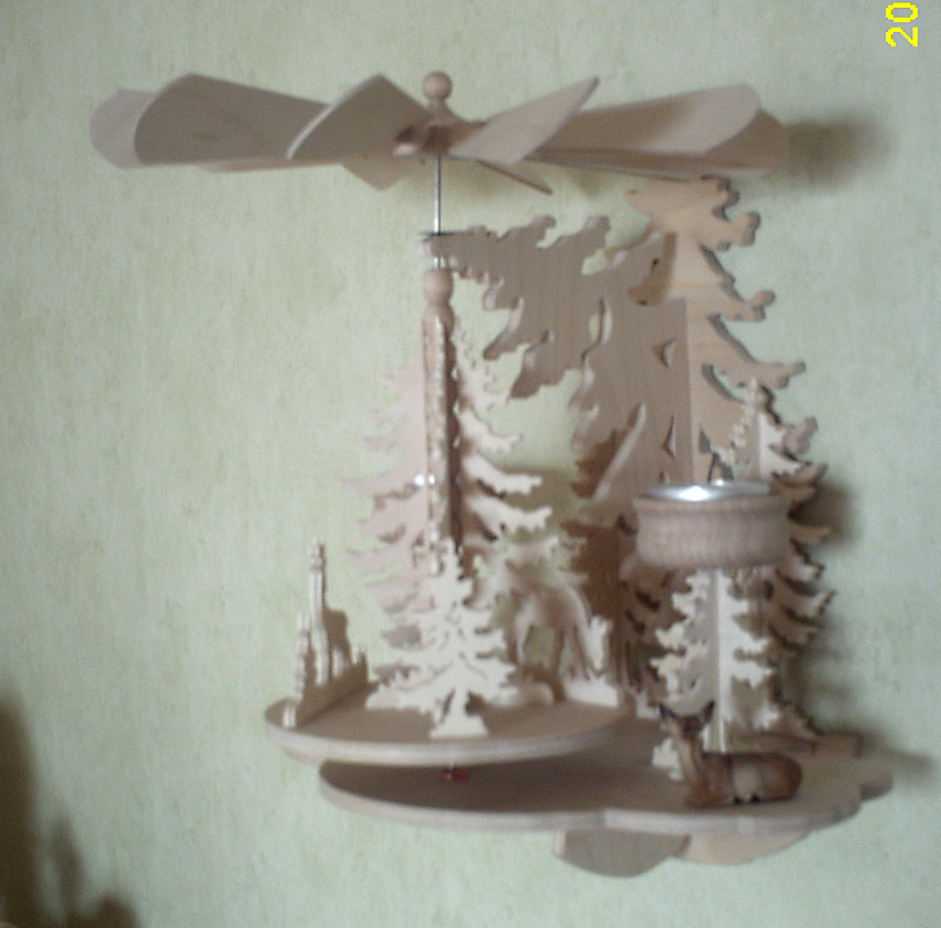 Weiter hat Herr Graf eine sehr schöne Weihnachtspyramide mit einem aufwendigen 6-eckigen Sockel gebaut. Bauzeit für die Pyramide ca. 6 Wochen. Zwei weitere Fotos zeigen eine Wand- und Tischpyramide.