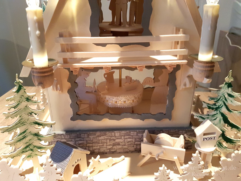 Den Motor habe ich im Sockel untergebracht, ( 3 U/min)  die Kerzen Beleuchtung mit Fernbedienung, einfach toll.“
