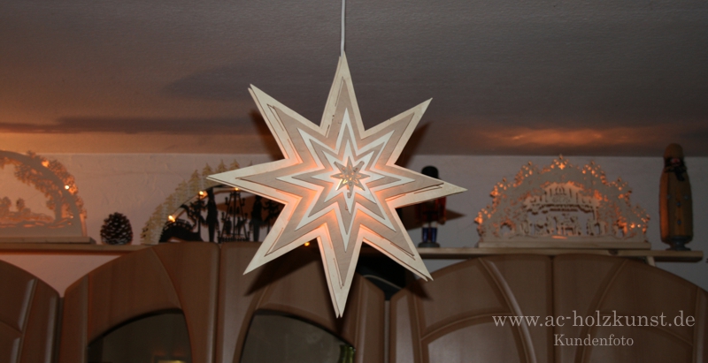 Herr L. hat uns Fotos seiner Laubsägearbeiten zugeschickt. Zu sehen sind eine Hängepyramide „Wolke mit 9 Engel“, zwei Schwibbögen und eine Fensterbild „Stern“ in mehreren Ebenen.