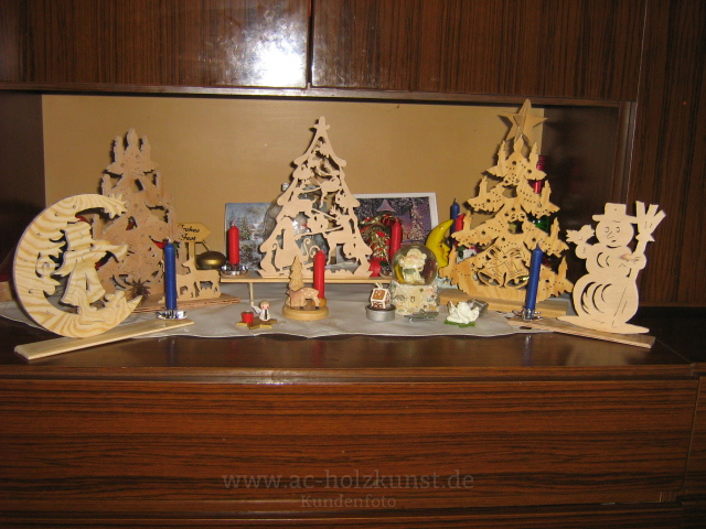 Eine weiteres Bild zeigt eine Pyramide mit Motiv „Frauenkirche Dresden„. Höhe ca. 27cm. Im dritten Fotos sind weitere Laubsägearbeiten von Herrn T. zu sehen. Vielen Dank.