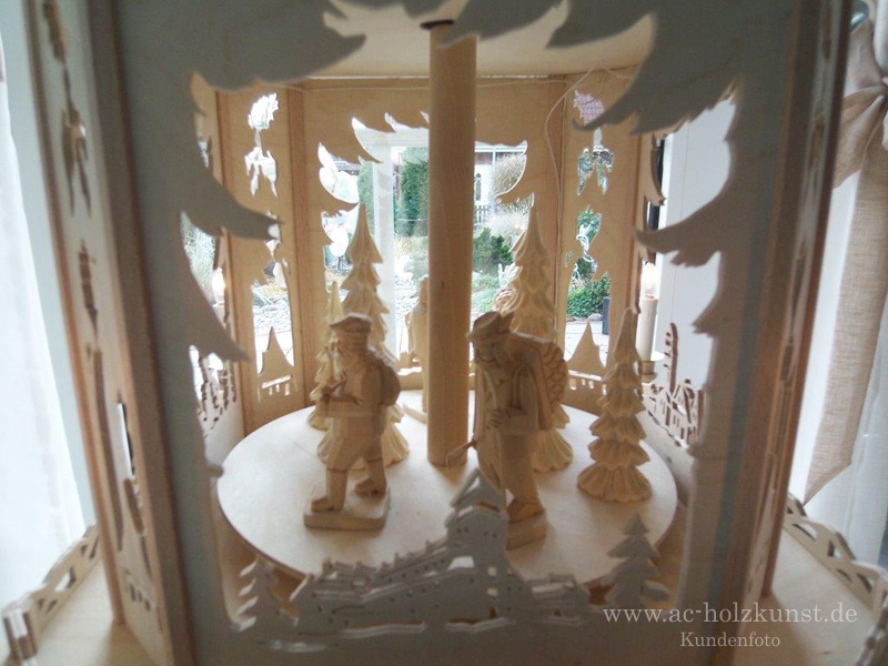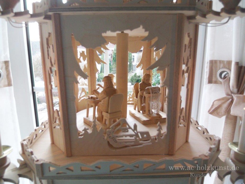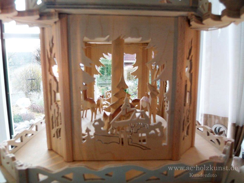 Info Fam. Meyer: „Die Erzgebirgspyramide haben wir vierstöckig angefertigt, wobei die untere Etage aus dem Schwibbogen Laubwald entstanden ist.